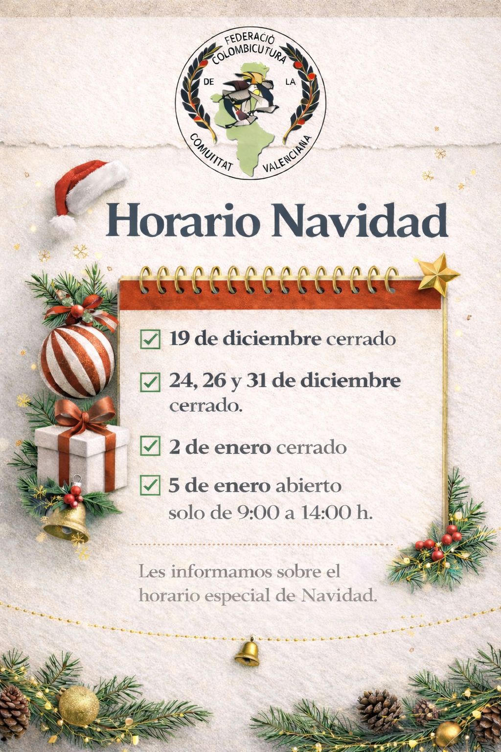 Con motivo de las fiestas navideñas, la Federación de Colombicultura de la Comunitat Valenciana informa del siguiente horario especial de atención: