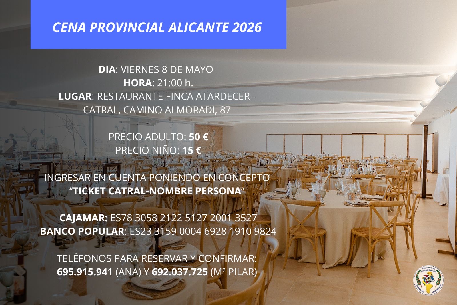 Ya se puede adquirir el ticket para la Cena Provincial de Alicante 2026, que tendrá lugar en Catral. Se anima a todos los asistentes a reservar su plaza con antelación. Del mismo modo, es imprescindible que quienes ya tengan su ticket confirmen su asistencia para organizar las mesas.