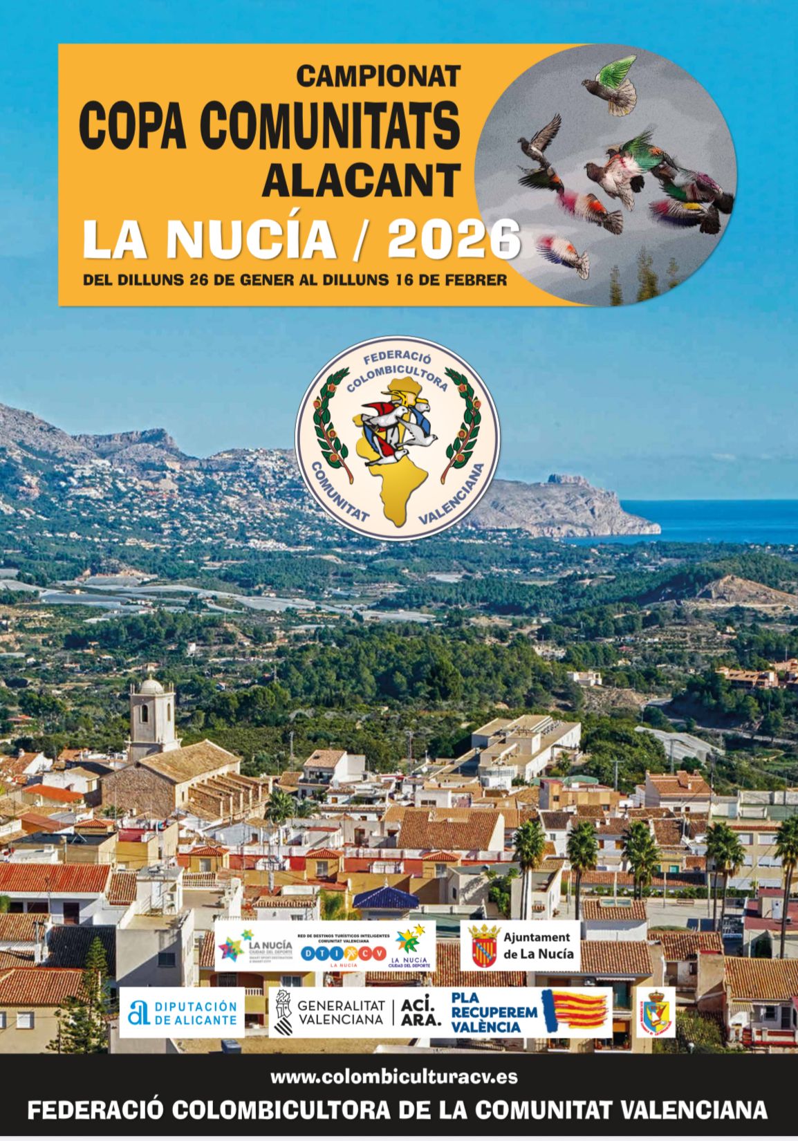 La Federación Colombicultora de la Comunitat Valenciana (FCCV) anuncia oficialmente la celebración del Campeonato Copa Comunitats 2026 en la localidad de La Nucía (Alicante).