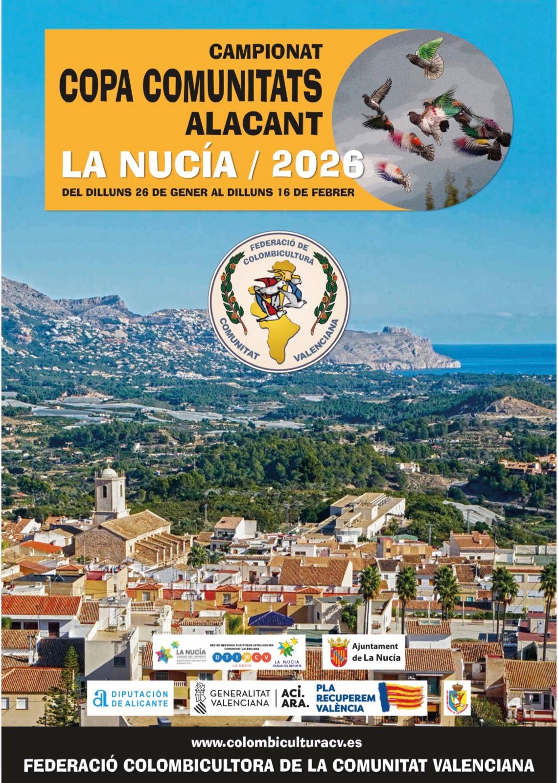 La Federación Colombicultora de la Comunitat Valenciana informa que el Campeonato Copa Comunitats 2026, previsto inicialmente para comenzar el lunes 26 de enero, se ha retrasado cuatro días, pasando su inicio al viernes 30 de enero de 2026.