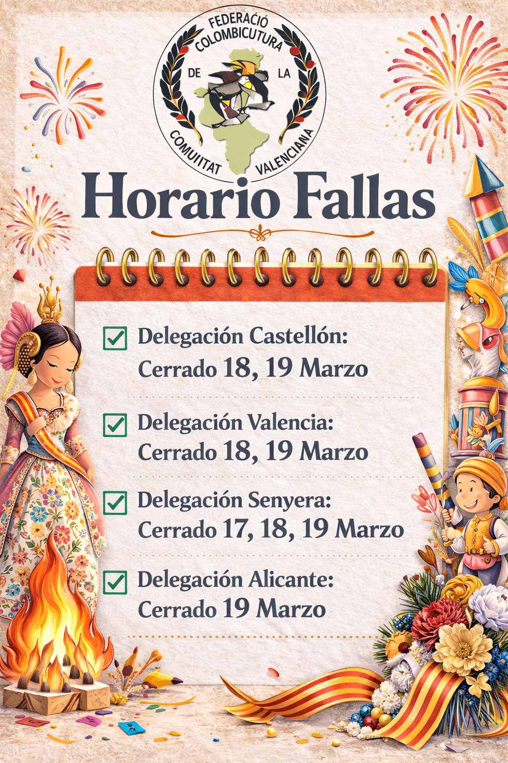 La Federación de Colombicultura de la Comunidad Valenciana informa del horario especial de sus delegaciones con motivo de la celebración de las Fallas.