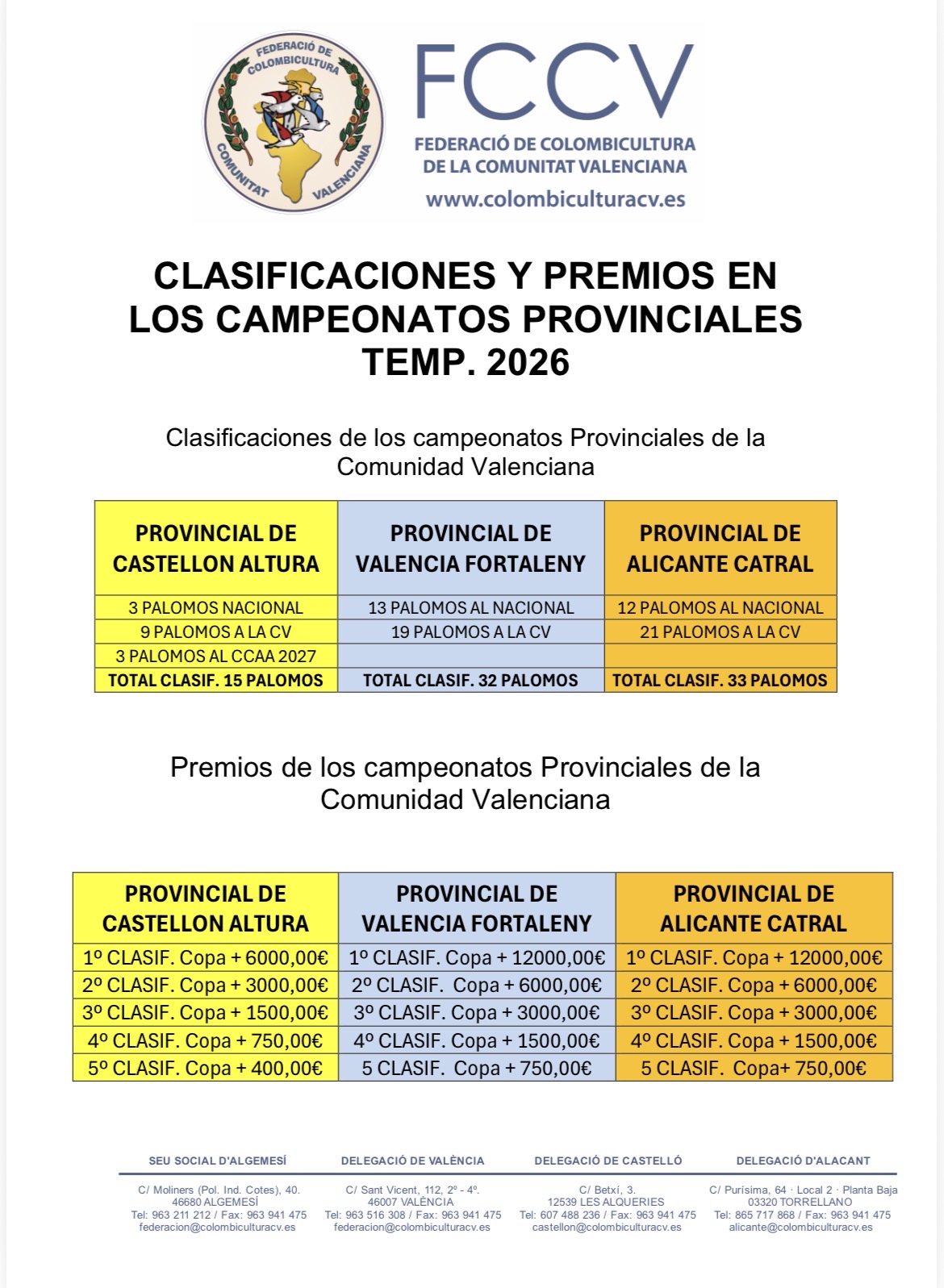 La Federación de Colombicultura de la Comunidad Valenciana presenta las clasificaciones y premios de los Campeonatos Provinciales 2026.