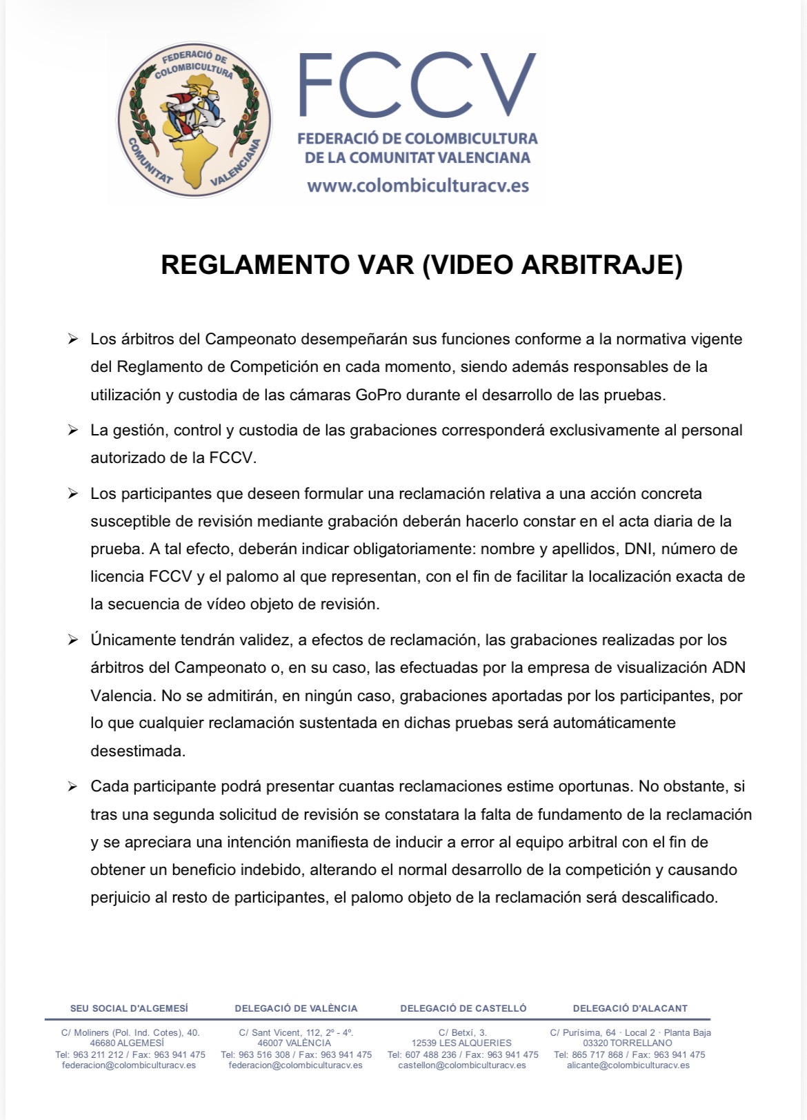 La Federación de Colombicultura de la Comunidad Valenciana recuerda a todos los participantes la vigencia del sistema de Video Arbitraje (VAR) durante el desarrollo de las pruebas, como herramienta para garantizar la correcta valoración de las acciones.