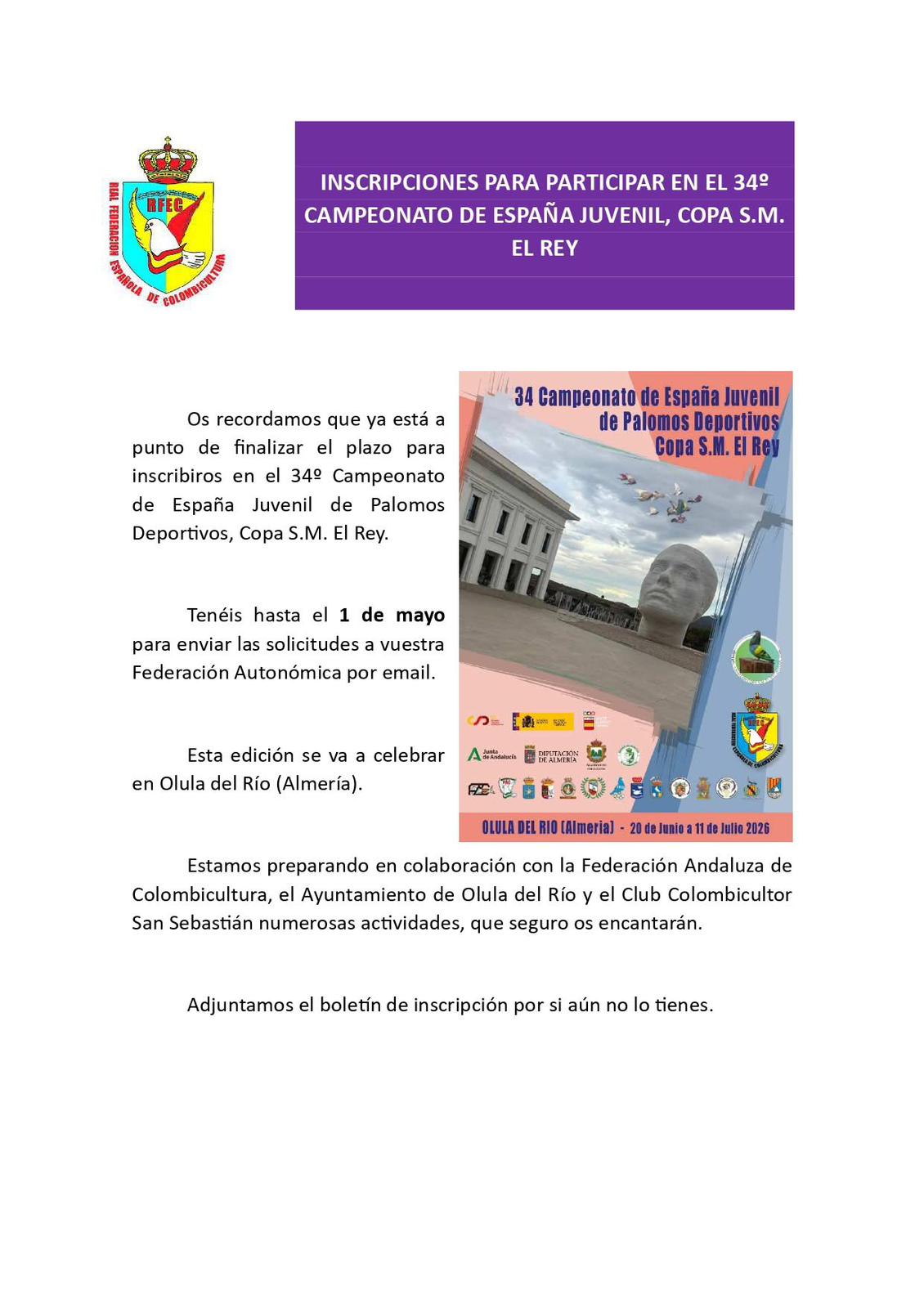 La Federación de Colombicultura de la Comunidad Valenciana anima a todos los jóvenes aficionados a participar en el 34º Campeonato de España Juvenil de Palomos Deportivos, Copa S.M. El Rey.